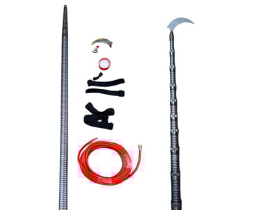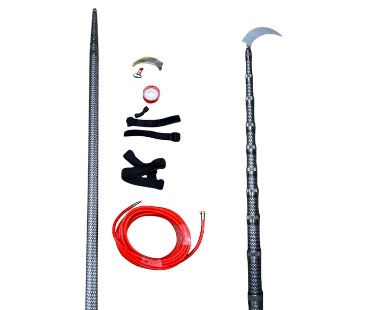 This 30ft Carbon Fiber "Dothi" is a lightweight, telescopic agricultural harvesting pole. It features a curved sickle blade for high-reach cutting and includes an integrated high-pressure hose and nozzles for simultaneous crop washing or treatment, enabling safe and efficient elevated harvesting.