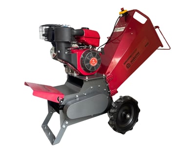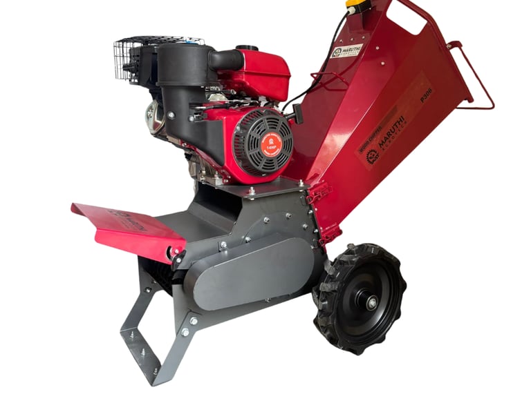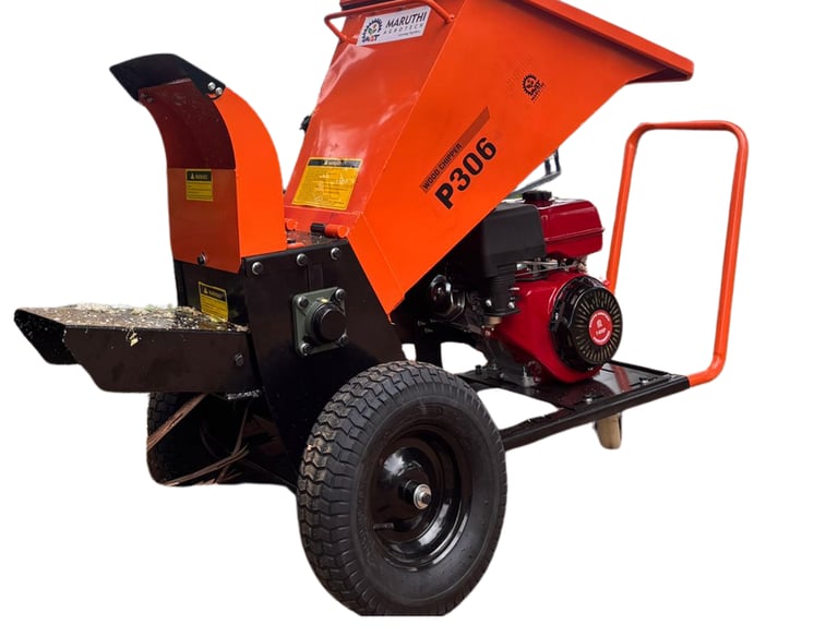 This is a powerful Maruthi Agrotech MAT-S306 Wood Chipper featuring a 16 hp petrol engine. It efficiently chips branches up to 12 cm (approx. 4.7 inches), boasts a large 65×70 cm feeding opening, and uses a reliable double V-belt transmission. Its 158 kg weight and pneumatic tires ensure high power with easy job site mobility.