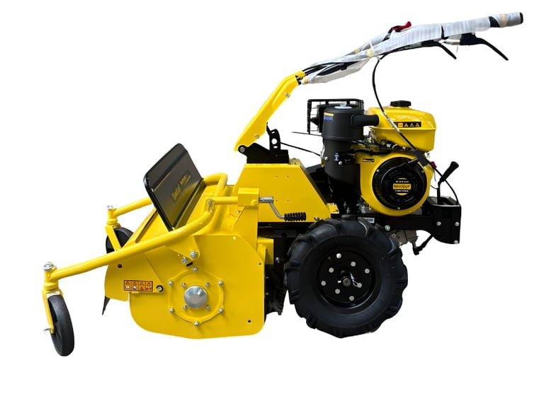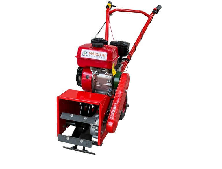 This is a powerful and agile Stubble Mower featuring a 9 hp (approx.), 302 cc, 4-stroke petrol engine. Its 2 ft (600 mm) cutting width is ideal for field residue clearance. The transmission includes 3 forward gears and 1 reverse gear, combined with an easy turning mechanism for excellent maneuverability and high efficiency in agricultural land preparation.